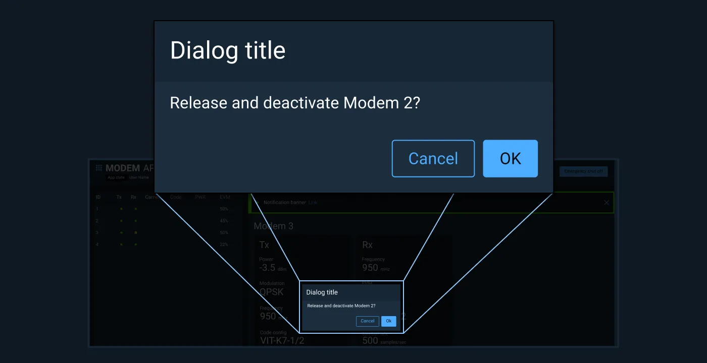 For events that require the user’s immediate attention and response, a modal Dialog may be used. Modal Dialogs should be avoided if possible, as they deliberately interrupt all other user interaction which could be critical.