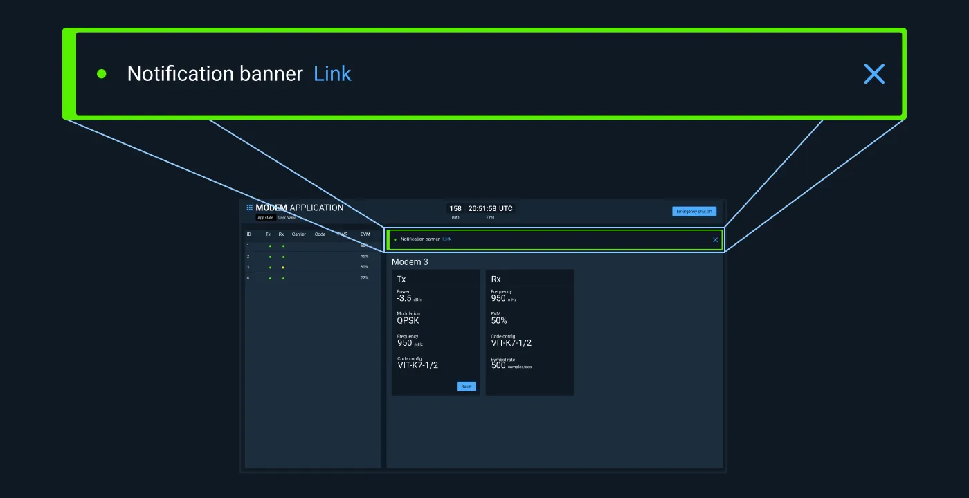 This notification would require the operator to restore the signal, changing their task from monitoring to troubleshooting. An application designer should use a modal or banner to display the notification as the message is important enough to grab the user’s attention and require that they respond to the notification immediately.