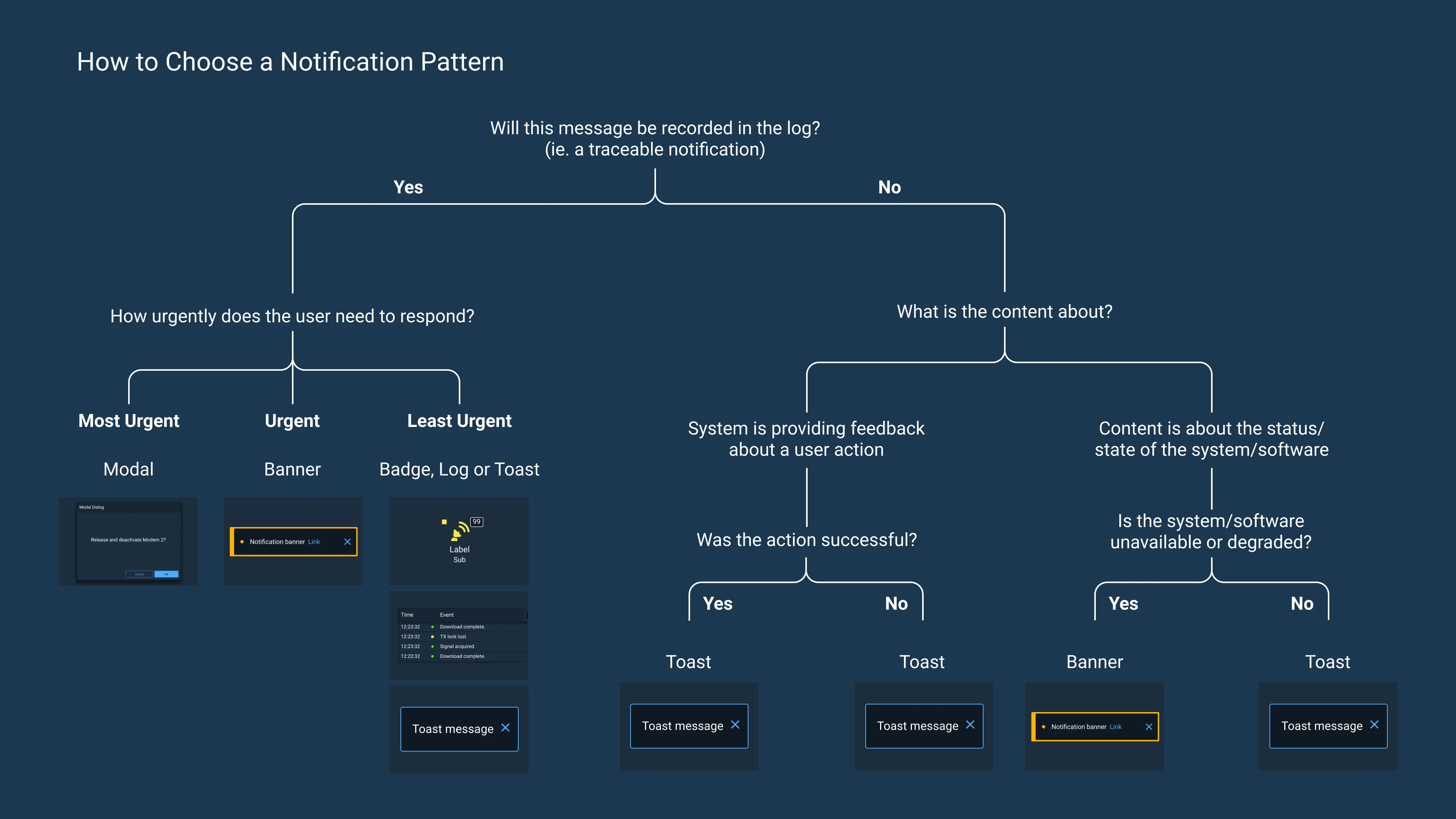 When choosing a pattern for notifications, you must first choose which type best fits the message content. As it has been defined, notifications will be communications with the user that hold information which needs to be accessed later. This information may or may not require a response and will have different levels of urgency.