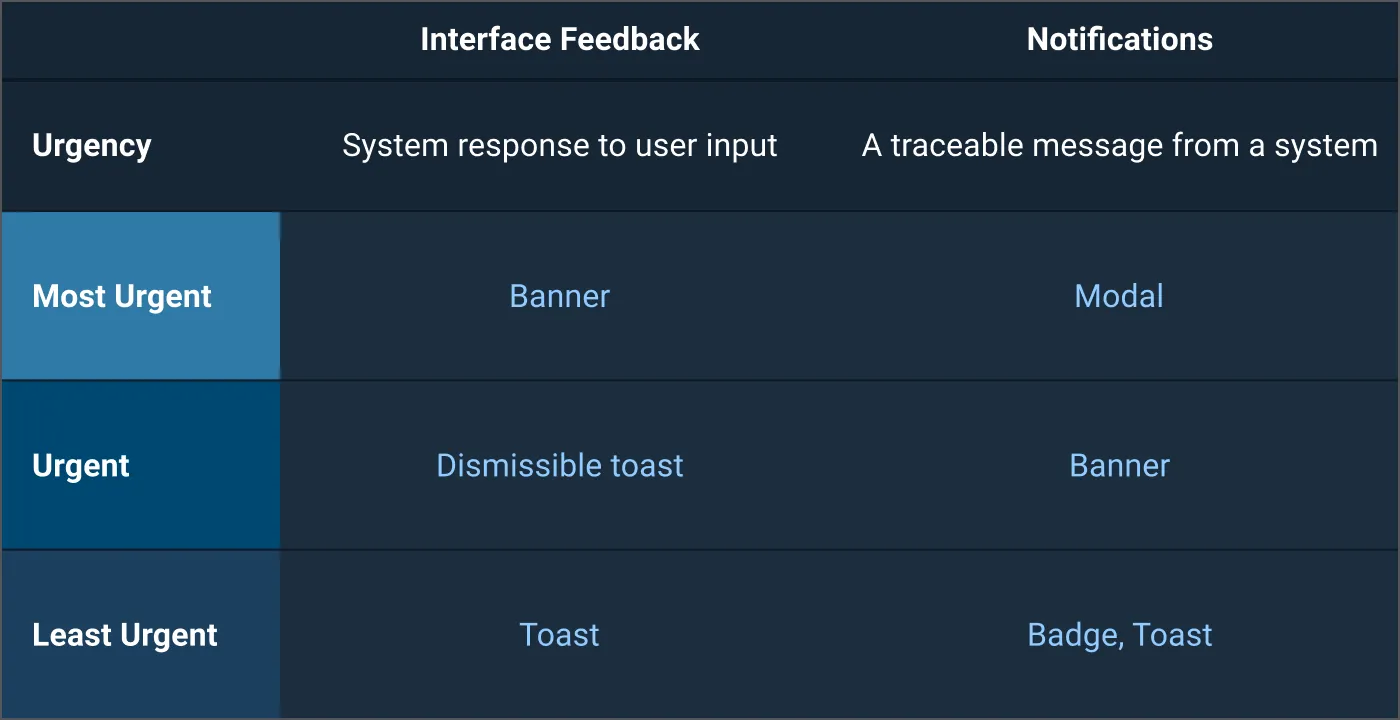 - Actionable - The information in a notification helps the user complete their current task more effectively, or clearly re-directs the user to another task.